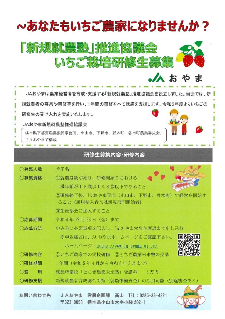 「新規就農塾」推進協議会 いちご栽培研修生募集
