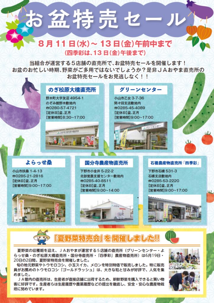お盆のお忙しい時期、野菜がご多用ではないでしょうか?是非JAおやま直売所のお盆特売セールをお見逃しなく!!