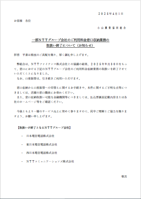 <一部NTTグループ会社のご利用料金窓口収納業務の取扱い終了について(お知らせ)