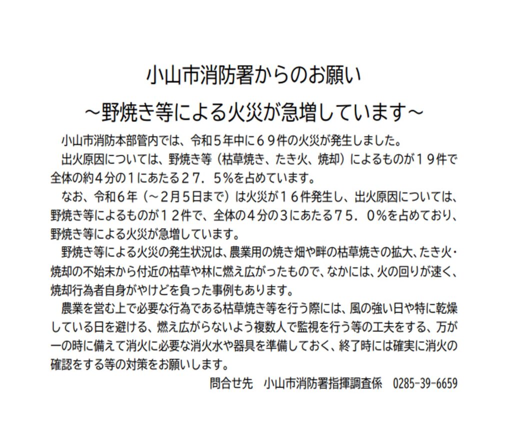 小山市消防署からのお願い~野焼き等による火災が急増しています~