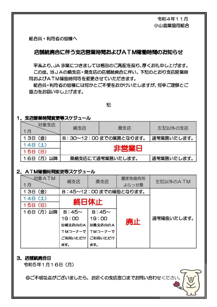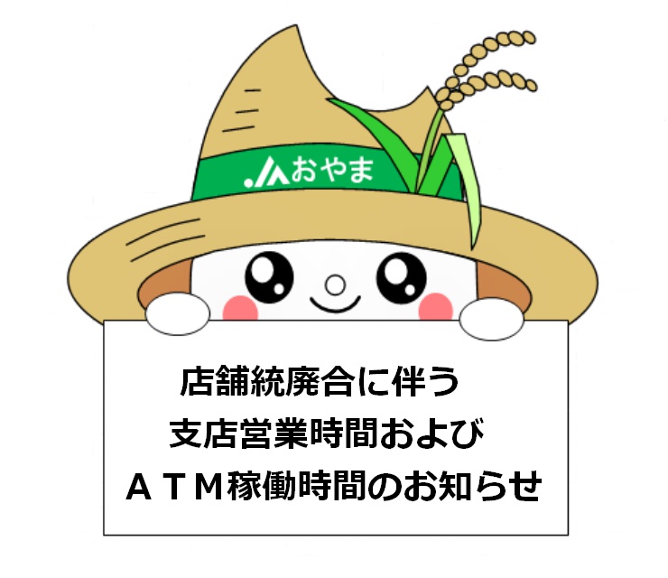 店舗統廃合に伴う支店営業時間およびATM稼働時間のお知らせ