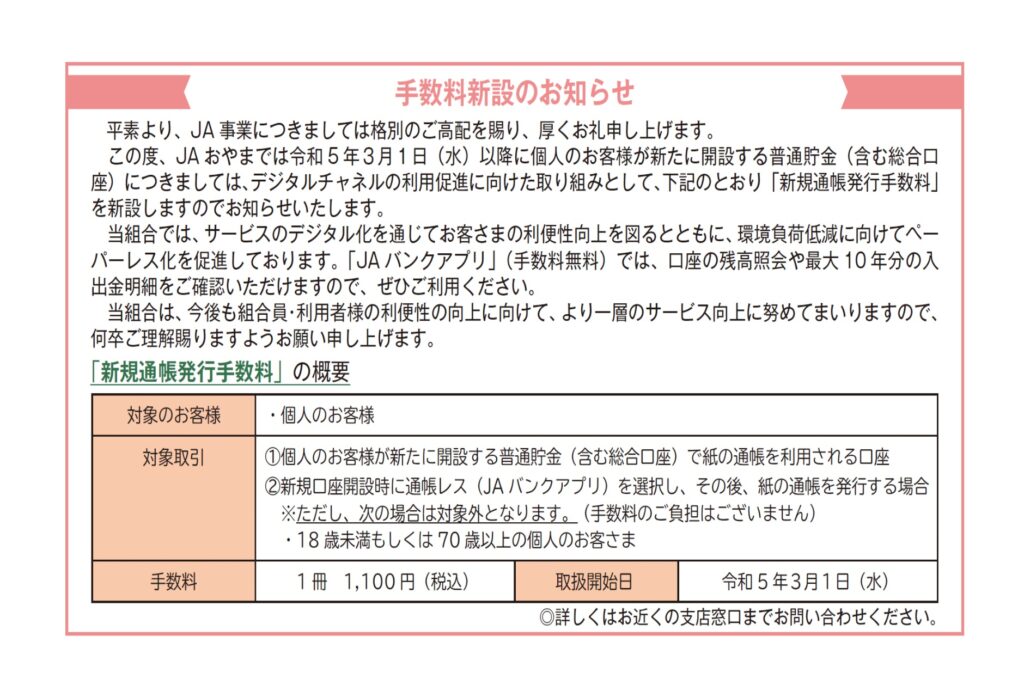 手数料新設のお知らせ