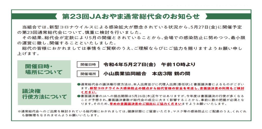 第23回JAおやま通常総代会のお知らせ