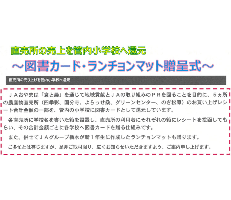 【変更】直売所の売上を管内小学校へ還元~図書カード・ランチョンマット贈呈式~