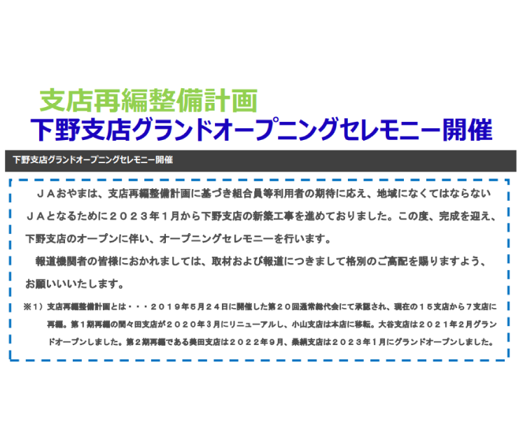 支店再編整備計画 下野支店グランドオープニングセレモニー開催