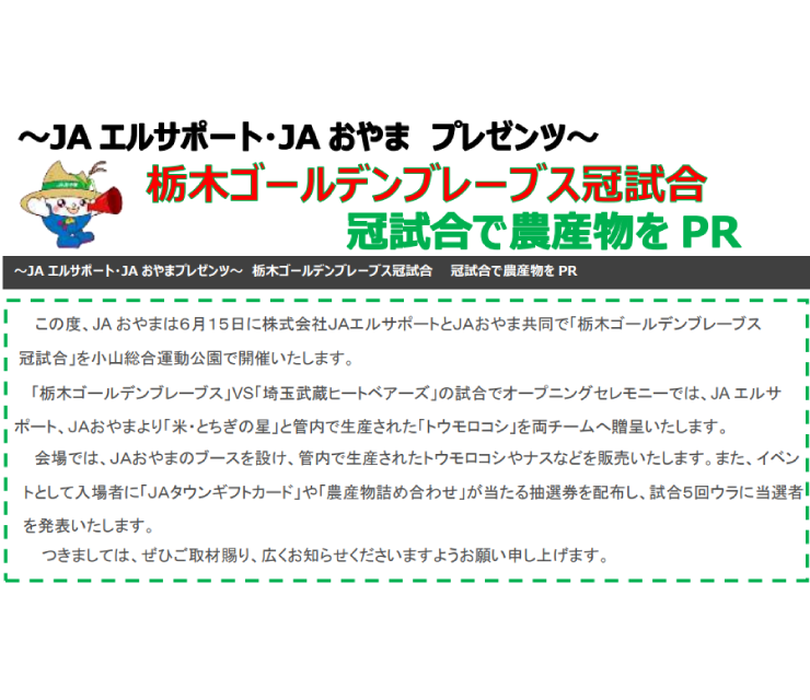 栃木ゴールデンブレーブス冠試合 冠試合で農産物をPR